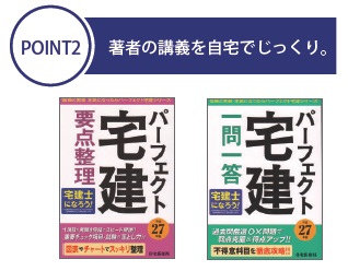 万円以上と高額です。 当講座は通常の通信講座の倍以上の約74時間を低価格でご提供させていただきます。 | 「パーフェクト宅建 要点整理」「パーフェクト宅建 一問一答」を使用し、出題傾向を踏まえ解説を進めてまいります。著者の教室講義を、自宅や通勤先で受講いただけます。なお、配信後は試験日まで繰り返し視聴いただけます。 ※ 本講座は左記の2冊を教材を使用します。お持ちでない方 は、申込時に「テキストあり」をご注文ください。 |