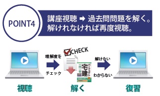 | 25 年を超える講師実績と高い合格率を誇る 山口智一の人気の宅建講座をそのまま撮影・編集し、最短3日以内に配信。 通学講座と同様の間隔で自宅や通勤先で学習いただけます。 なお回答および解説は、弊社WEB ページにて掲載させていただきます。 | 講座を視聴、その後、各視聴動画ごとに添付されたその範囲の過去問題・「パーフェクト宅建 一問一答」を解く。 都度、問題解くことにより理解度をチェックすることが可能。 わからないところがあれば再度講座を視聴し復習をする。 この繰り返しが大切です。 通常の一般的な通学講座では、講義は1度きりですが、何度もご覧いただけることも、本サービスの特徴です。 |